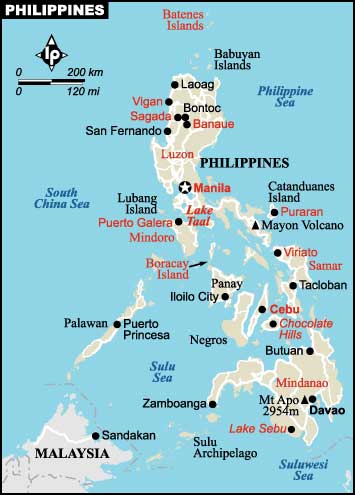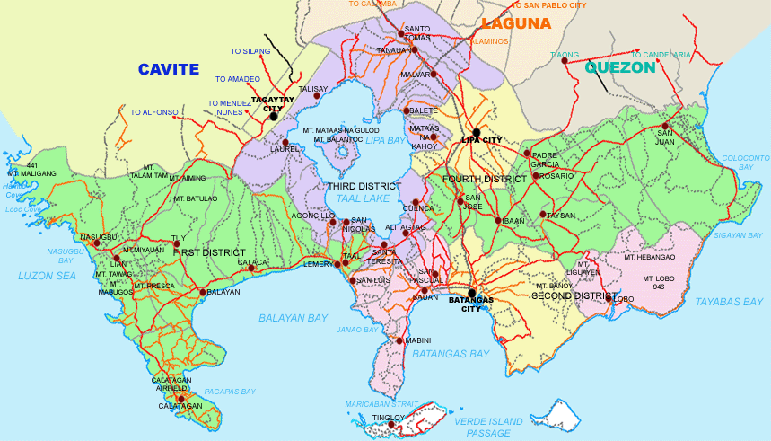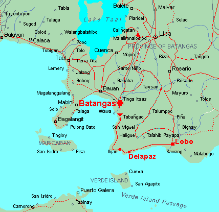The town of Taal can be found on the eastern shore of Balayan Bay. Taal was the home of Simplicio and Juliana until the turn of the 19th century, after which they moved to Aplaya, a barangay of Bauan and southeast of Taal (Aplaya itself is not shown on the maps below.) Aplaya is right on Batangas Bay. Their youngest son Rafael or "Paito" was the only one of the eight children to remain and make his home in Aplaya and Lola Kanang lived there most of the time. On her frequent trips to Manila, she took turns staying with her other children. The lot in Aplaya was purchased by Simplicio in October 1909 for the princely sum of 500 pesos. The house sits less than 100 meters from the bay but today it sits empty, forlorn and boarded up. But within its walls are imbedded the peals of laughter of the children and grandchildren, the strong guiding words of Lola, the heartbreak from World War II and finally the family's pride as all of Lola's children, and many grandchildren, went on to fruitful and distinguished careers. The maps below progressively show the relative location of Taal within the province of Batangas and in the archipelago. The town of Bauan is only about 100 kilometers south of Manila. The northernmost shore of Lake Taal is about halfway between Bauan and Manila.